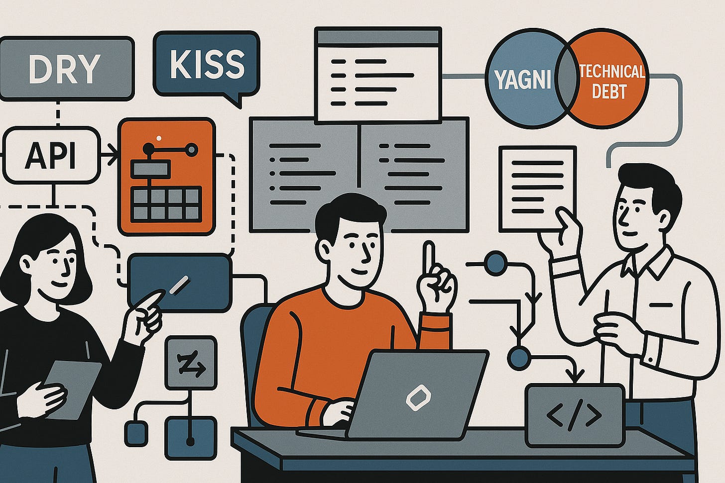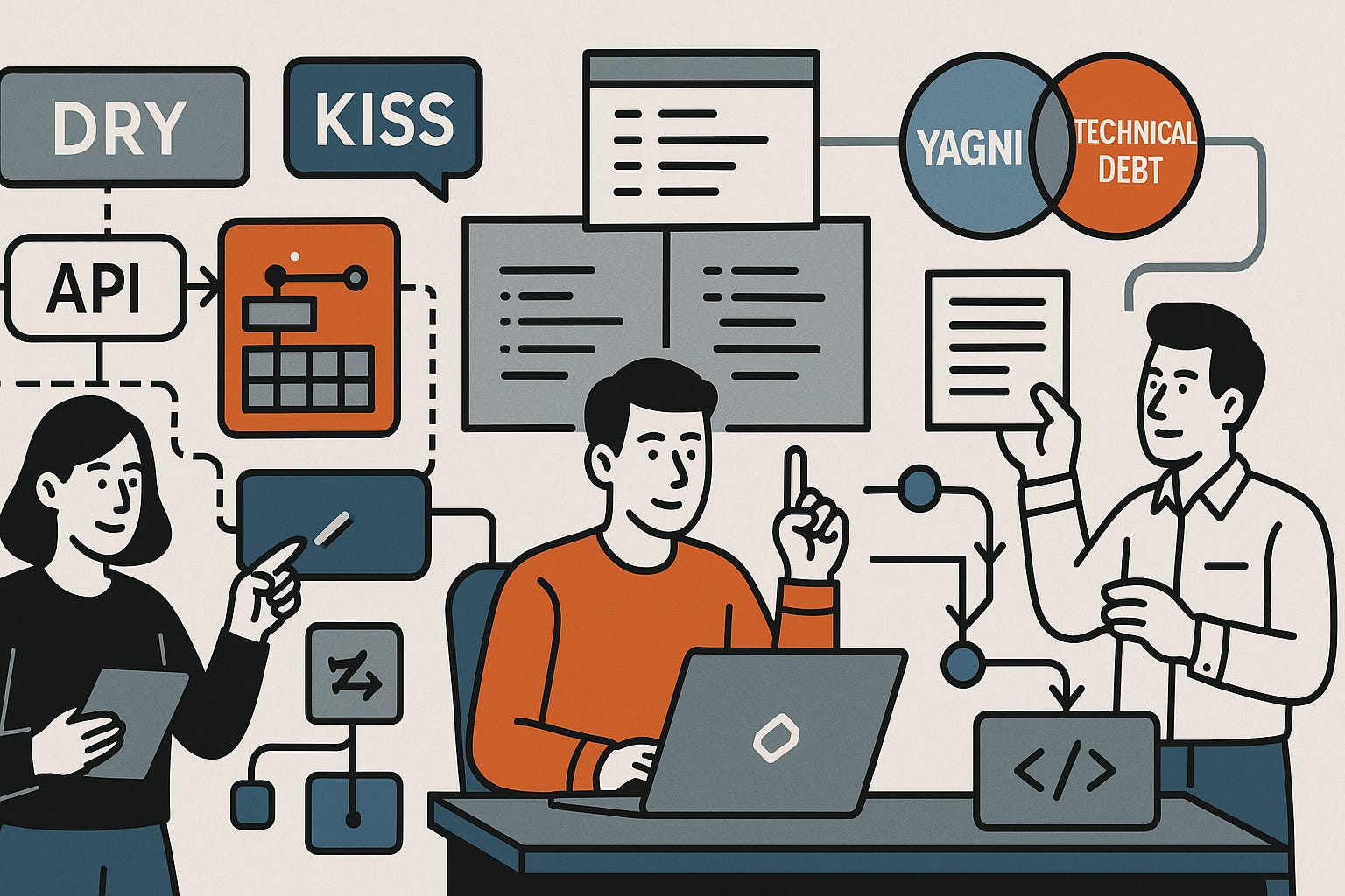 Call to action. Grab 20 minutes with your tech lead this week and ask: Which of these principles, if we applied it more consistently this quarter, would most accelerate our roadmap? Then put one concrete change (a debt budget, a flag strategy, a DRY refactor, a trunk‑based integration policy) into your next planning cycle. That’s how you build bridges—not just backlogs.